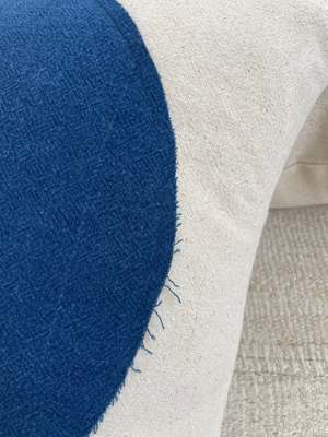 Introducing our Moon Pillow Collectiona harmonious blend of minimalism and artistry, featuring a playful take on texture and color. Each pillow has two sides: one in a solid hue, and the other with a unique circular patchour "moon"with raw, organic edges that give it a relaxed, modern look. Available in two sizes, 18x18in and 28x28in, the collectsion comes in four distinct color variations: - Himalayan Moon on White: A soft, earthy pink circle on a crisp white background. - Indigo Moon on White: Deep blue meets the purity of white for a bold contrast. - Mustard Moon on White: A warm, golden tone adds brightness to the neutral white base. - White Moon on Indigo: A striking white circle set against a deep indigo field. Each pillow is crafted for versatility, offering a perfect statement piece for your living space, whether you prefer a pop of color or a more neutral tone. These pillows are soft, stylish, and designed to bring a touch of artistic elegance to any room. Insert included with feather and down. Process: Somnath is the artisan from West Bengal who hand spun and wove this cotton fabric. This pillow is dyed, cut, sewn, and hand-stitched in Rajasthan, where we met a cooperative during our last trip to India. The manager started this cooperative 4 years ago to provide jobs to the women in the area so they could send their children to school. Care: To maintain its beauty, cold hand wash separately. Refresh in a bath of gentle soap or gently use your hands to slightly rub. Use a natural detergent that does not contain citrus or other acidic oil scents. Machine dry on low or hang dry out of direct sunlight. This product has been dyed or block-printed using ancient techniques. Colors may gradually change over time.