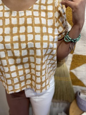 This is a hand-spun, handwoven, block-printed cotton top by Happy French Gang. /// Large Front Length from Shoulder: 22" Kia is wearing a size Medium. /// 100% cotton, woven and printed in India. Handwash. /// Happy French Gang is a sustainable textile company with apparel and home dcor collectsions. All the textiles are hand-spun, hand-woven, hand-dyed and hand-stitched with an organic cotton. HFG works with a small cooperative in India and knows all the artisans involved in the process. As a company they qualify as Eco-friendly, Women Owned, Small Batch, Organic, Handmade and Ethical. @happyfrenchgang