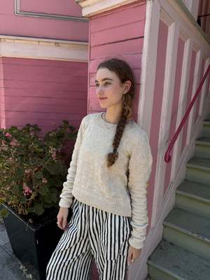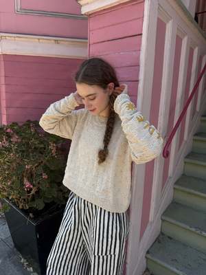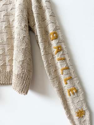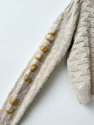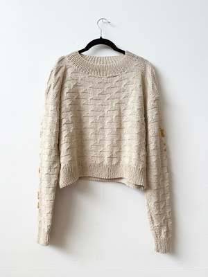 This sweater is hand knit and naturally dyed by artisans in India using 100% organic cotton. It features hand-crochet appliqu for a unique touch. Dimensions (measured flat; loose knit allows for stretch): Small: Chest 59cm/23in, Length 49cm/19.2in, Sleeve length 40cm/15.7in Medium: Chest 61cm/24in, Length 51cm/20in, Sleeve length 40cm/15.7in Large: Chest 63cm/25in, Length 53cm/20.8in, Sleeve length 40cm/15.7in Care: Hand wash in lukewarm water with mild detergent. Do not soak. Lay flat to dry and store folded.
