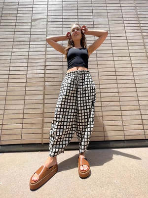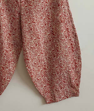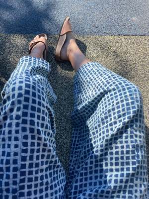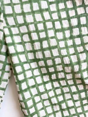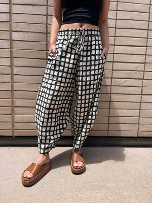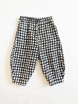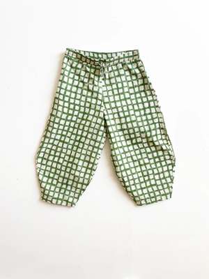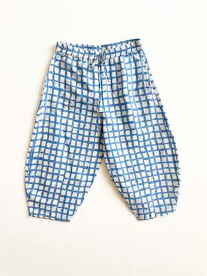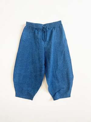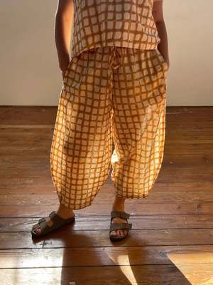 The Marius pant has a relaxed fit, and is made as a one size fits many (S to XL) Elasticated waist - Can be adjusted easily with draw strings Two side seam pockets Single layered with our 100% natural hand-woven cotton. Woven by our artisans in our cooperative in India. These pants have been hand-block printed. Hand wash. Model is 5'2". Dimensions: Total waist relaxed: 91cm / 35.8in Front rise From top edge: 39.5cm/ 15.5in Back Rise from top edge : 46cm / 18.1in Outseam length from top edge: 95cm / 37.4in
