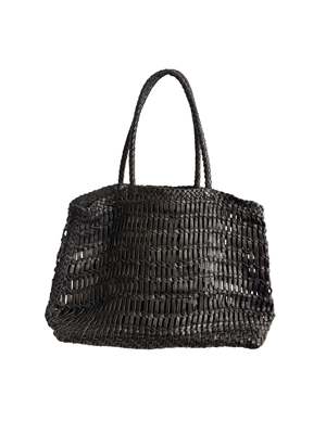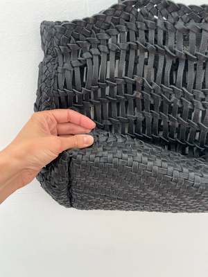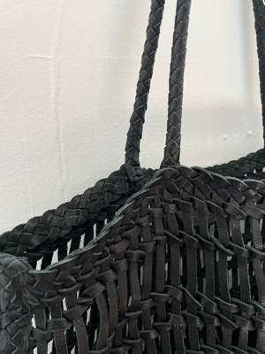 Introducing our Handwoven Luni Leather Bag a perfect blend of chic elegance and laid-back style. This unique bag features an airy, open weave design that allows you to see through, making it ideal for a breezy day at the beach or a stylish trip to the farmer's market. Its lightweight structure ensures easy carrying, while the handcrafted leather adds a touch of timeless sophistication. Whether you're packing towels and sunscreen for a sunny getaway or filling it with fresh produce, this versatile bag is the ultimate companion. Thoughtfully designed for both function and flair, it's the perfect balance of chic and chill for every occasion. Dimensions: Height: 12.6in/32cm, Width: 5.9in/15cm, Length: 15.7in/47cm, Handle Drop Length: 8.6in/22cm Care: Each leather bag is handwoven, resulting in unique variations in color and texture. Refrain from carrying excessively heavy items to prevent deforming the bags shape. If your bag gets wet, blot the water away immediately with a soft, dry cloth. Allow the bag to dry naturally in a well-ventilated area. Always store your bag in a soft dust bag when not in use. This allows air circulation and prevents mildew. Story: Since this bag is made in India we decided to name it after an Indian River. The Luni river is the largest river in the Thar Desert in Northwest India. It originates in the Pushkar valley of the Aravalli Range where our cooperative that makes all of our clothes at Happy French Gang is based!