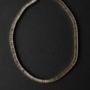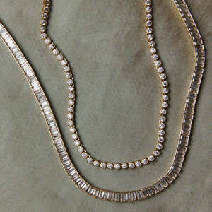 The Baguette Tennis Necklace by Hart features baguette-cut stones set in a classic tennis necklace design. Includes an extender chain for adjustable length, allowing for versatile styling. Details: - Dimensions: 6.2mm wide, 15 inches in length with 2 inch chain extender - Baguette set 5A CZ stones - Tarnish resistant 10K gold-plating over quality brass; nickel-free - Responsibly manufactured; plated with recycled gold in an environmentally-friendly facility.