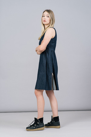 Harvey Faircloth Sleeveless Denim Dress -Sheath dress featuring an A line skirt with slight pleated detailing at waistline -Gold tone exposed zippers at sides with a raw edge hemline -Hidden back zip closure -Midweight lined denim fabric -100% Cotton -Dry clean only By Harvey Faircloth Styled with Ganni Masha Texas Boots Model in size 0, true to size. Model Measurements: Height 56, Waist 26.5", Bust 35", Hips 33"