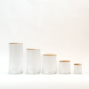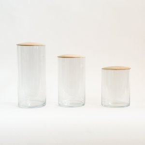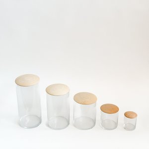 Simple, elegant countertop solution. Available in 5 sizes for collectsions of any size. Not air tight, but perfect for storing dry goods in any room (cotton pads in the bathroom, beauty tools on the vanity, most-used spices in the kitchen). Makes a cute terrarium or hurricane for a pillar candle, too. Material: Glass + maple Lid is not airtight Dimensions: Mini 2.5"D x 3"H, 6 oz Extra Small 3.5"D x 4"H, 18 oz Small 4.5"D x 6"H, 48 oz Medium 4.5"D x 8"H, 64 oz Large 4.5"D x 10H, 76 oz Glass is dishwasher safe. Wood: Hand wash only. Dry right away to keep wood from cracking. Oil regularly with food-grade oil, like mineral oil.