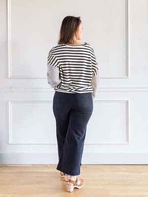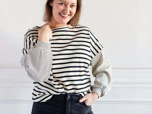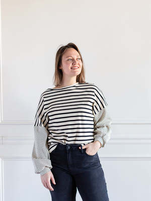Stripes, stripes, and more stripes! This waffle textured top has thick stripes running the torso and thin stripes running the slight balloon sleeve. So many fun ways to dress it up or down. Whatever you decide to do, you need this shirt to do it! Brand: Hayden Color: Oatmeal Fabric: 96% Cotton, 4% Spandex Care: Hand wash cold and hang dry Fit: TTS