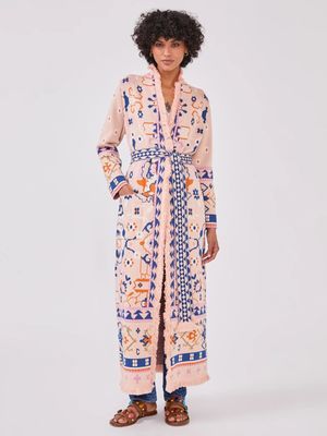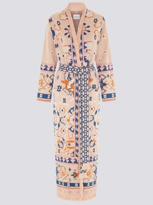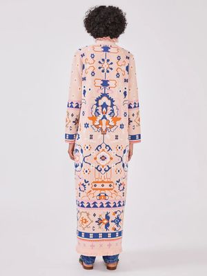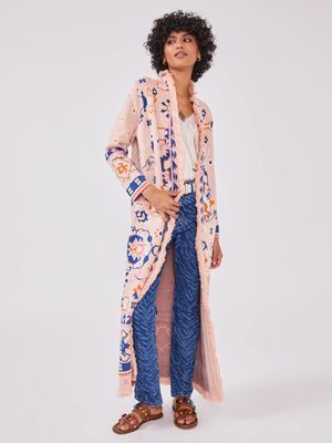 Made for the modern bohemian, this season's signature jacquard duster heroes geometric shapes inspired by vintage carpets and tapestries. Flecked with golden lurex for shimmer to elevate your everyday, pair this effortless fringed cotton jacquard cardigan with a silk vest and printed jeans for a uniform that works from school gates to departure gates. Crafted from 100% cotton 4.5 hours knitting time Fringe collar Long sleeves Knitted border belt provided Maxi length Avoid hanging