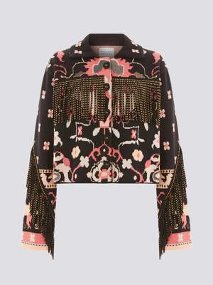 Drawing inspiration from vintage carpets, Hayley Menzies' Desert Loom Jacket brings a bohemian energy to your new season wardrobe. Jacquard woven with ornate shapes that have been enhanced with lurex shimmer, this knitted jacket also features vegan suede fringing for a Portobello-inspired twist. Layer over silky maxi dresses, or keep it casual with acid wash denim. Crafted from 100% cotton 4 hours knitting time Vegan suede fringing Velvet-covered buttons Press stud fastening Mid length Organic materials Natural fibres.