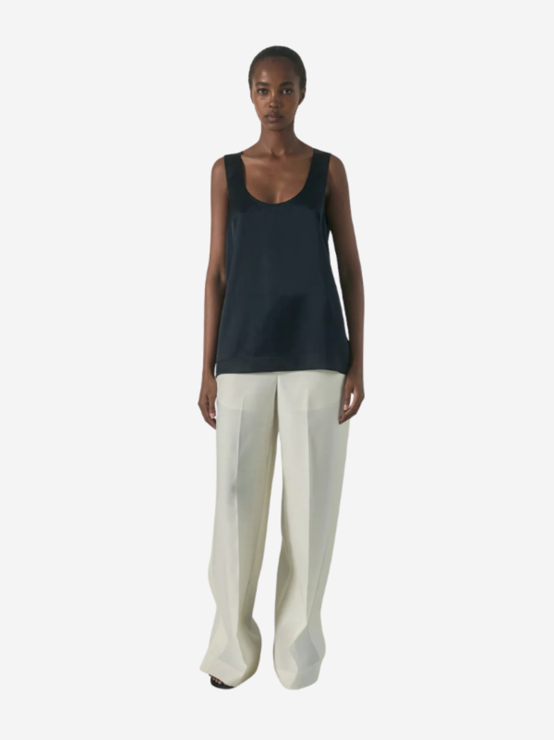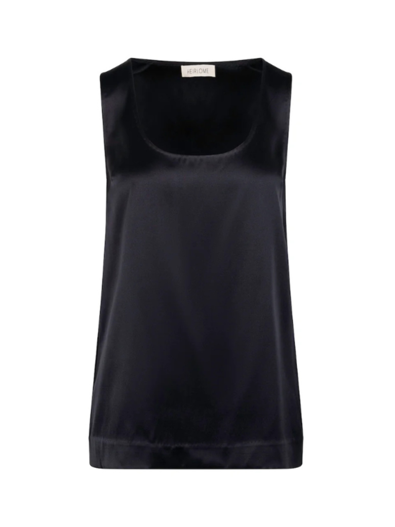 Heirlome's Elaine is an elongated tank top crafted from double-faced silk satin. It features a comfortable, straight fit through the body and is designed with an open scoop neckline. The garment is meticulously finished with interior French seams and blind stitching at the neckline, armholes, and hem for a seamless, refined appearance. Product Details Designer ID: HLXI051332 Color: Black Composition: 100% Silk