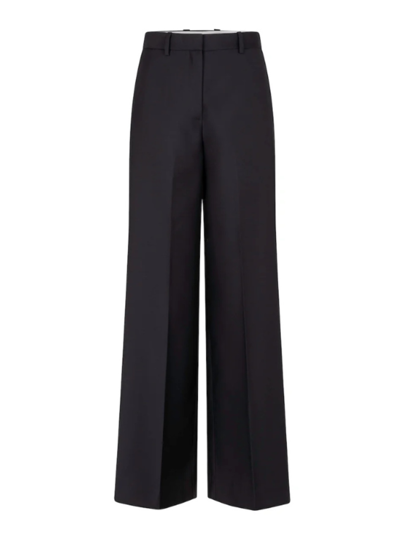 Heirlome's Valentina are relaxed, tailored trousers crafted from a silk and wool faille. Designed to sit just below the natural waist, these trousers offer a comfortable, eased fit through the leg. A signature side-flap detail extends from the waistband to the hem, concealing a discreet side-seam pocket. Refined touches include classic belt loops, a traditional interior waistband curtain for a secure fit, and rear besom pockets with button closures. Product Details Designer ID: HLXI0341 Color: Black Composition: 32% Silk, 68% Wool