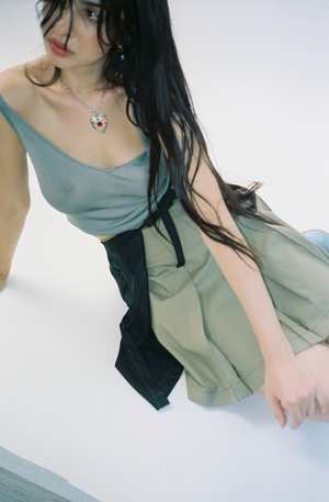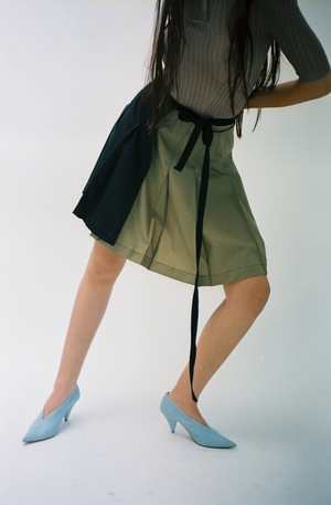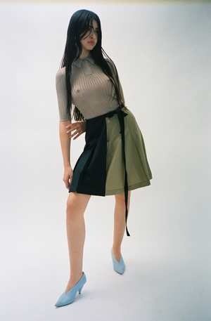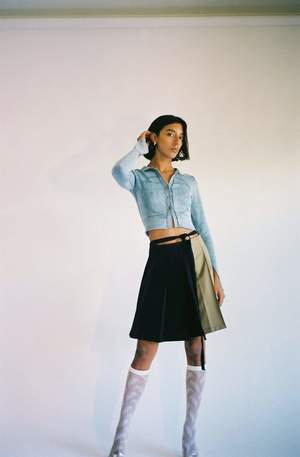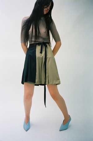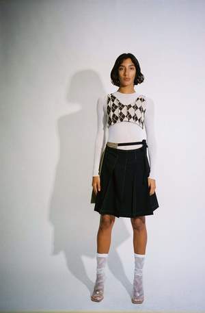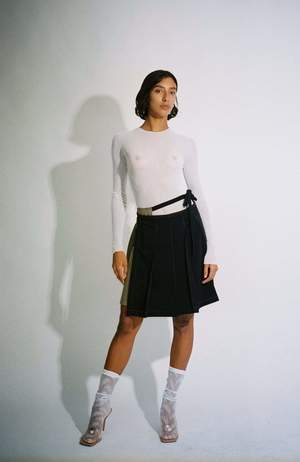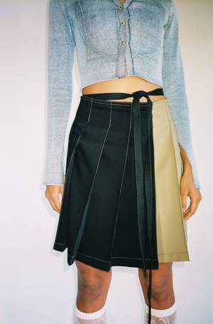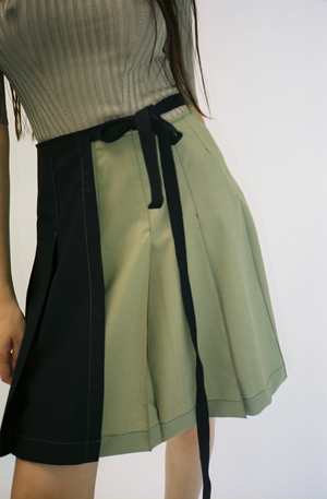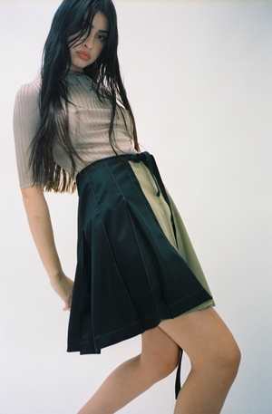 NOTE: This is a PRE-ORDER. This item will ship in September 2022. One size. Knife pleat bicolor wrap skirt with contrast stitching pintuck in each pleat. Features an extended tie that wraps around like a belt. Adjustable wear, could be worn on high hip or low waist, fits a variety of sizes. Worn with the Blue Zodiac Cardigan and Argyle V-Neck Bra.