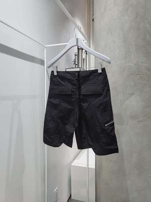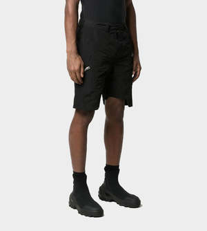 Technical fabric shorts with overlapping layers and metal HE snap closure. Shaped seam details, and sipper pocket on right leg. Vendor Colour: Black Vendor Style: SS21_M_10_014_P04_BLK01 Fabrication: 100% Nylon. Imported. Machine wash cold gently. Do not bleach. Do not tumble dry. Do not Iron. Do not dry clean.