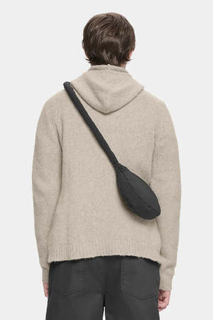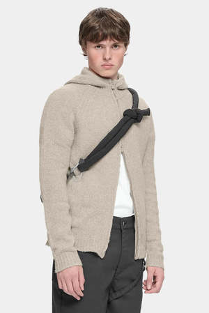 Slim fit knitted cashmere hoodie with recycled components. Features a plastic injected zipper. Composition: 57% RWS Superfine Merino Wool, 25% Cashmere, 18% Recycled Nylon. Colour: Dark Stone.