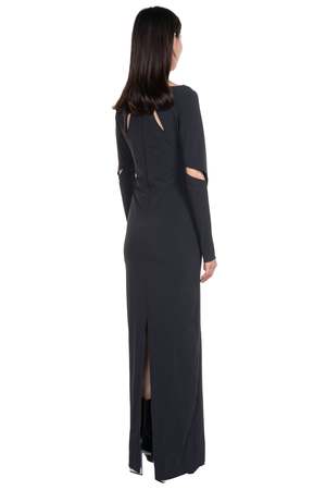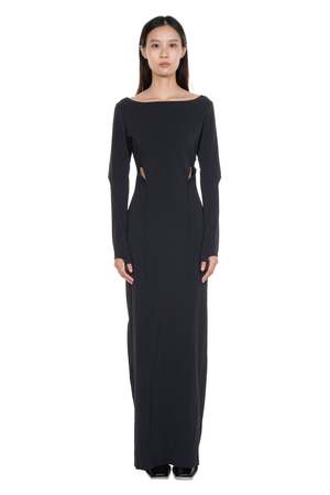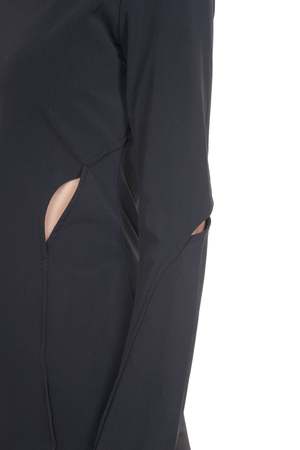 The Juul brothers came to fashion in a roundabout way allowing them to communicate a consistent and clear vision, creating their universe for then add onto it with products. HELIOT EMIL adds elegance to an alternative fashion environment with every new product as seen with the Resilience Technical Dress Black. The brand continues to explore the relationship between form and function, delivering a monochromatic collectsion that leans towards softer shapes and utilises unconventional materials. Black technical dress from Heliot Emil. Long sleeves. Wide neck. Slicing details throughout. Slit a back. Thumbhole details. Soft stretchable fabric. Colour: Black. Composition: Poly