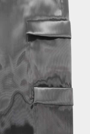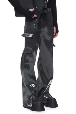 The Juul brothers came to fashion in a roundabout way allowing them to communicate a consistent and clear vision, creating their universe for then add onto it with products like with the Liquid Metal Cargo Pants. Signature Liquid Metal trousers, now in oversized cargo style with pockets. Oversized fit. Liquid metal fabric. Patch pockets at sides of legs and back. Diagonal zips in trouser hem for flared fit adjustment. Hook and eye closure waistband. Edgebound seam allowances with front and back lining. 'H'-beltloop at back. Colour: Liquid Metal. Composition: Nylon