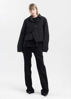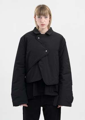Concordance puffed shirt in black. Paneled asymmetric construction with a spread collar, asymmetric press-stud fastening across the front face, and adjustable panel fastening at the rear hem. Finished with tonal stitching and silver-tone hardware throughout. Relaxed Fit 100% Polyester Imported Model is wearing a size 48 Model is 5'10 (178 cm), 100 pounds (45 kg), usually wears S in tops. A size 24 in denim and XS in trousers. Size 8 in shoes. *FINAL SALE* *Note slight frosting may appear on clothing due to the reaction between the garment and packaging. Steam the article to remove any white discoloration/residue*