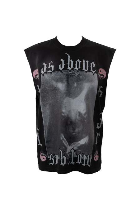 The As Above So Below Muscle Tee by Hellstar delivers a bold, statement-driven look rooted in contemporary streetwear. Crafted in Los Angeles from custom-milled cotton, the shirt is treated with a signature vintage wash and potassium spray, giving it a distinctive worn-in character and unique finish. Designed with a classic muscle tee silhouette, it features oversized Hellstar graphics screen printed across the chest and back for maximum visual impact. Cut to fit true to size, this piece combines comfort, attitude, and standout style. Type: T-shirt