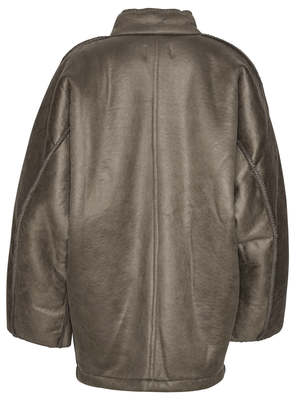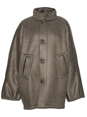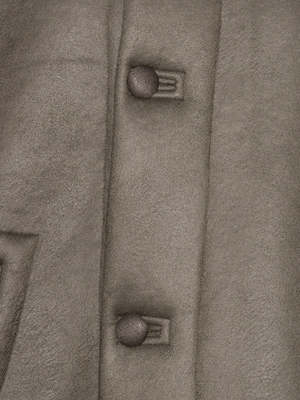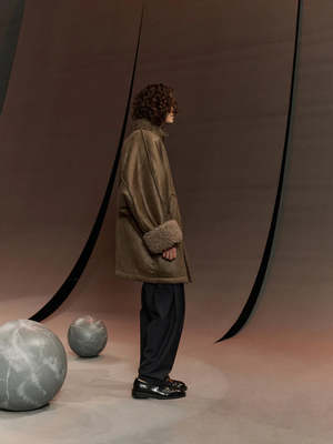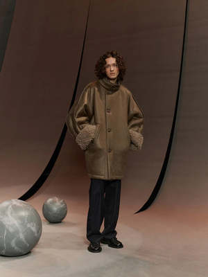 The Dart Jacket by Henrik Vibskov offers both style and warmth in its long, thick, full wool design. The button collar adds a touch of sophistication while the mid-thigh length provides extra coverage. Complete with big cuffed sleeves, this jacket is designed for a comfortable, looser fit. The jacket is reversible with one side featuring a wool finish with shearling sleeve cuffs, the other has a shearling finish with wool sleeve cuffs. 100% Wool.