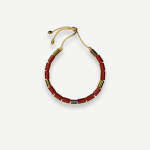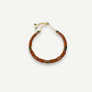Her New Tribe is a collectsion of statement-making, color-focused small-batch ceramic jewelry. This piece features caramel brown gloss and gold gloss beads on gold cord. Handmade ceramic beads and semi-precious beads on knotted cording with brass ends. Adjustable length. Each piece is formed, fired, and assembled by hand in Austin, Texas. FINAL SALE