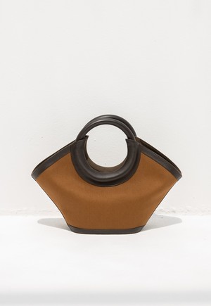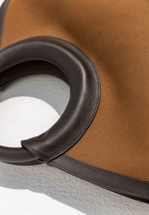 crafted in heavy cotton twill and trimmed with calf leather and cotton lining. - Flat pocket on interior - Magnetic fastening tap at open top - Measurements: 53 x 30 x 13 cms - Handle drop: 15 cms Handmade in Spain