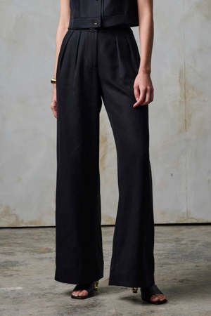 The Alina Pant by Hevron is cut from 100% Tencel and features a fitted, high-rise waist, pleated front, and zip and button closure. A removable belt and wide-leg silhouette complete the look. Composition: 100% Tencel Color: Black Fit: High rise, wide leg, full in hips.