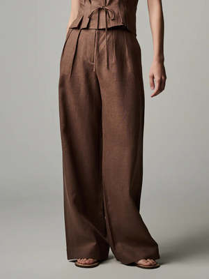 The Alina Pant by Hevron is cut from signature 100% linen and features a fitted, high rise waist, pleated front, zip and button closure, removable belt, and wide-leg silhouette. Composition: 100% Linen Color: Chocolate Fit: True to Size
