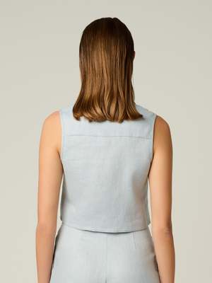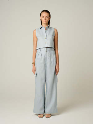 Effortless confidence starts here. The Katja Top is a cropped shirt that flatters your figure without revealing too much. It pairs perfectly with high-waisted Alina or Maggie pants for a balanced, chic look thats perfect for everything from a casual brunch to a night out. Composition: 100% Linen Color: Dusty Blue Fit: True to Size