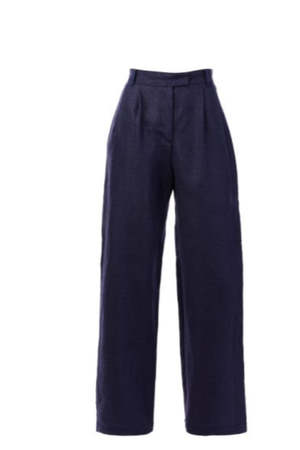 The Michelle Pant by Hevron features an elastic waist in the back with clasp, button, and zipper closure. Composition: 100% Linen Color: Indigo Fit: True to Size Final Sale.