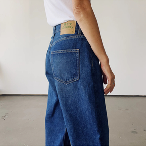 The Wide Slouch is Hey Gang's newest denim silhouette. Meant to be a bit slouchy, this jean is a mid-rise designed to sit at your natural waist, with a wide, long, flattering leg. The Harris wash is named after the lovely Emmy Lou Harris. 100% Cotton Made in LA. Measurements from size 25: - Waist: 29" - High hip: 34" - Inseam: 30"