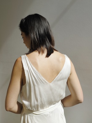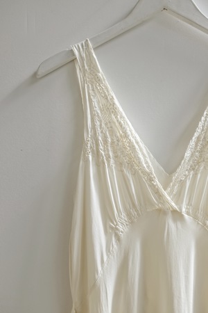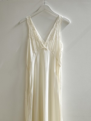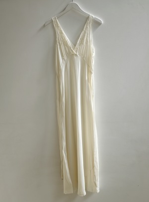 Stunning antique silk maxi slip dress with an embroidered neckline. This piece has ties attached to the sides to wrap around the waist and tie in the front or back. Minor vintage marks on hemline. Size medium. The ties allow for this dress to fit small-medium depending on desired style. 14-15" Shoulder to shoulder seam 36" Bust 58" Length