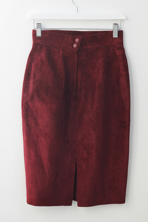 High-waisted vintage suede straight-cut skirt in a rich oxblood color. Zipper and button closure on the back. Waist measures 25" and hips measure 35". Length from the top of the waistband to bottom of skirt is 25". Great condition with regular vintage wear.