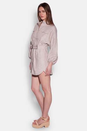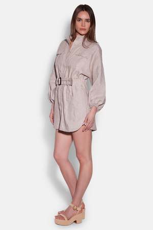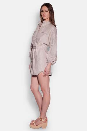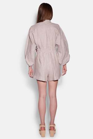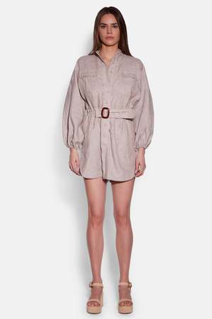 The Amelia Playsuit by Hides blends structure and ease. Featuring voluminous sleeves, utility-style chest pockets, a button front, and a cinched elastic waist with a tortoiseshell buckle belt, its your one-and-done outfit for warm days and nights. Cotton linen blend.