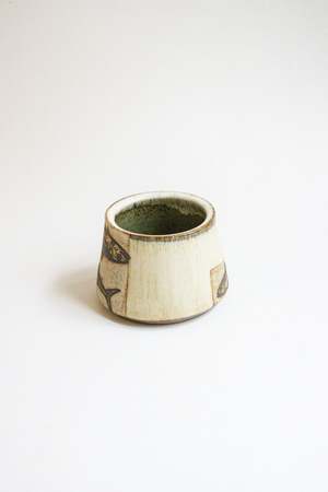 A mackerel mug that's sure to make any fish lover smile. Each mug features two fish stacked on one side and one fish on the reverse. The handle, inner, and part of the side are glazed. Please note that each mug's glaze will appear slightly different. Holds approximately 12 ounces. The main body of the mug measures 2.5 in tall x 4.5 in wide; the handle extends off the side of the mug. Each mug will vary slightly due to the handmade nature.