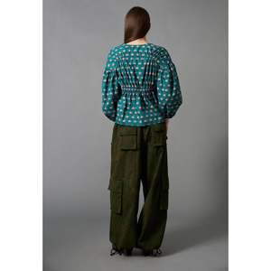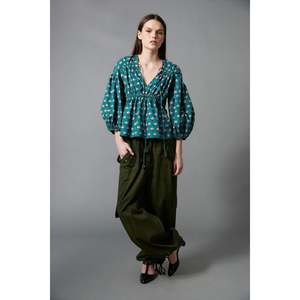 100% GOTS Certified Organic Cotton Poplin The Shirred Blouse features a shirred bodice with an empire waist and tasseled drawstring ties at the front chest. Full, elbow-length sleeves have elasticated cuffs. The pullover style includes an elasticated waist for comfort. Length: 24 inches. Cotton certified by the Global Organic Textile Standard ensures it was grown without the use of pesticides and requires ethical working conditions and environmentally responsible manufacturing from farm to factory.