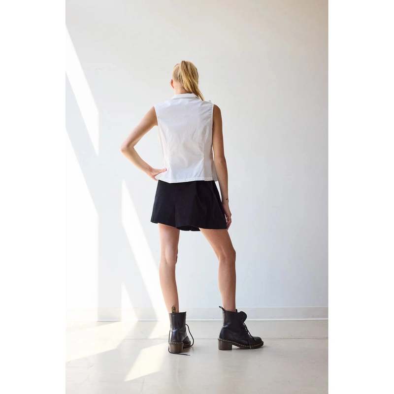 100% GOTS Certified Organic Cotton poplin. Classic sleeveless blouse with Peter Pan collar and frill appliqu detailing at the front bodice. Cotton certified by the Global Organic Textile Standard ensures it was grown without the use of pesticides and requires ethical working conditions and environmentally responsible manufacturing from farm to factory. Akoya buttons at center front. 22'' length from HPS.