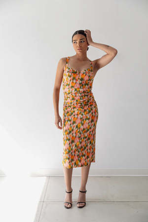 53% Viscose, 44% Ecovero Rayon, 3% Spandex. Our Sophia dress has a sweetheart neckline, shirring at the midsection, and a slit opening at the back for walking ease. Ecovero is a standard that ensures the fibers used in viscose fabric come from sustainably certified forests. EcoVero viscose is made using sustainable wood from controlled sources, including FSC (Forest Stewardship Council) or PEFC (Programme for the Endorsement of Forest Certification) certified sources. Recycled power net lining. Invisible zipper at back. 39'' length from armhole.