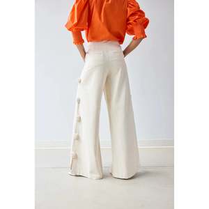 95% organic cotton and 5% spandex. Relaxed fit pants decorated with cotton thread pom pom details at the sides. Off-seam pockets at the front. Fully lined with organic cotton lawn. Cotton certified by the Global Organic Textile Standard ensures it was grown without the use of pesticides and requires ethical working conditions and environmentally responsible manufacturing from farm to factory. 31 inseam, 15 leg opening (measured flat).