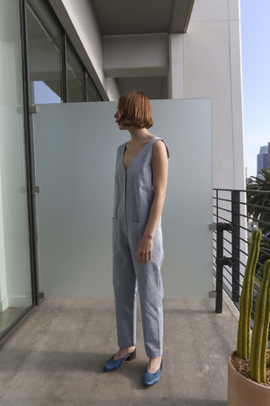 Horses Atelier Sleeveless Patch Pocket Jumpsuit in Blue Stripe - Italian crisp cotton, loose fit, V-neck, front mother of pearl buttons, two front patch pockets, tapered, cropped leg, hits above ankle. - Fabric: 100% cotton - Made in Toronto