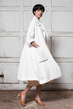This oversized linen coat from Horses Atelier features a high buttoned collar, slip pockets and back vent with a button front closure and cuff detail. Hits mid-calf. 100% linen Made in Toronto Dry clean only Loose flexible, fit. Model is 5'7", measurements are bust 29", waist 25", hips 34", normally wears a size 0 or xsmall in tops, and is wearing a size 1 here.