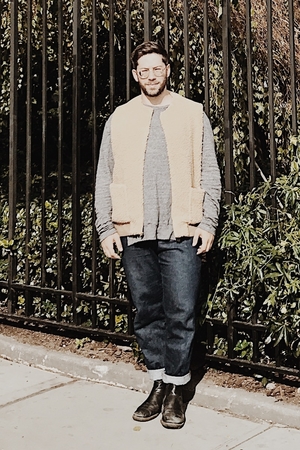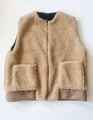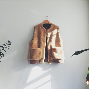 65% Poly 35% Acrylic Sherpa 100% Bemberg Lining With two front patch pockets and a slightly oversized fully lined body, this Sherpa Vest is the ultimate layering item. - zip front - front patch pockets - warm Model wears size M Made in NYC