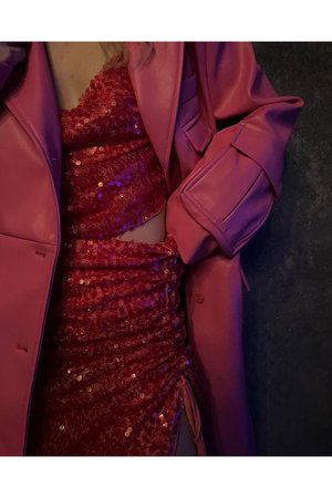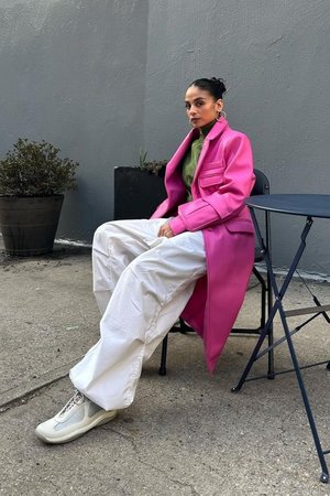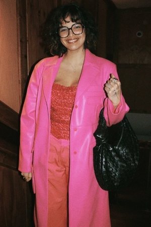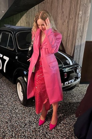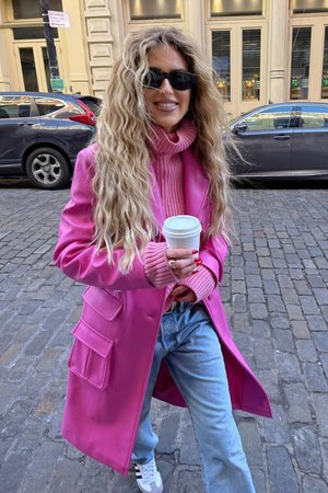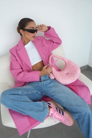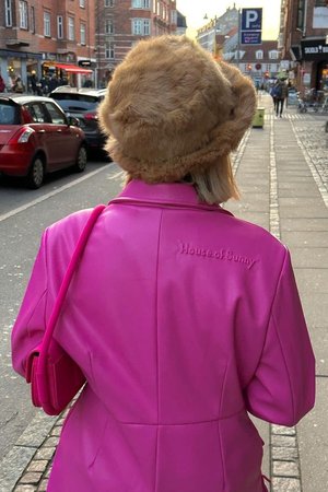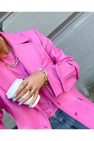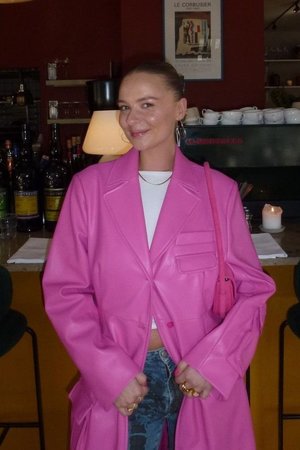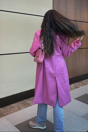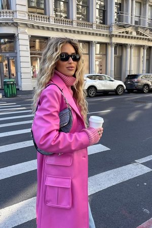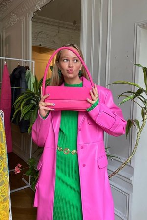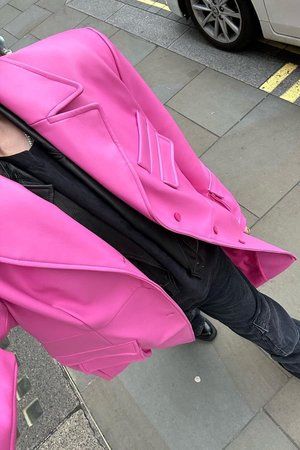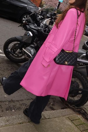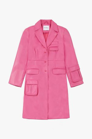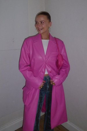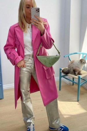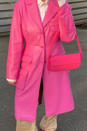 Pair it with Falling Kiwis Hockney, Falling Kiwis Sleeve, The Prima Bag - Azalea, or Clarity Bikini - Pink Sapphire for a full hot pink look. Crafted from super soft vegan leather in hot pink, this long-line trench features functional pockets to the front and arm, inspired by military wear but for the modern woman who isn't afraid of making a statement. Finished with tonal embossed branding to the back shoulder. Let them stare in awe at The Studio Overcoat. This candy-pink leather look coat is not for the faint of heart or wall flowers - this House of Sunny statement will have you standing out in any crowd. With its knee-length shape, it offers the perfect combination of glamour and cold-weather protection. Whether you want to add some extra pizzazz to your daily wardrobe or just make an unforgettable entrance at your next gathering, The Studio Overcoat meets your needs. As seen on @ashleygraham, @bluie, @danie.sierra, @dashaglamorama, @deidreolsen, @emilisindlev, @emmabreschi, @emmamoldt, @lounorthcote, @luanabarron, @lucyalicelook, @marianamachado____, @olafarahat, @pinkyswearwhat, @sim.mrena.luhova, @sierrarenas, and @sofieaarnes. - Knee-length soft vegan leather trench. - Functional pockets to the front and arm. - Tonal embossed branding to the back shoulder. - Inspired by military wear. - Color: Azalea. - Super soft vegan leather. - Material: Body - 100% Polyurethane; Lining - 80% Polyester, 20% Cotton. - Measurement: UK 6 (US 2) XS: Length 41.5" (105.5 cm), Chest 18.7" (47.5 cm). UK 8 (US 4) S: Length 42" (106.5 cm), Chest 19.7" (50 cm). UK 10 (US 6) M: Length 42" (107.5 cm), Chest 20.7" (52.5 cm). UK 12 (US 8) L: Length 42.7" (108.5 cm), Chest 21.7" (55 cm). - Model is 5'9" (175 cm) and wears UK size 8 (US size 4 or S). - Professionally clean. Iron on low heat. Do not tumble dry. Do not bleach. - This product is 100% vegan, never use real animal products (incl. leather & wool). - Dyed using methods supporting environmental protection regulations. - Recycled labels and biodegradable poly bags.