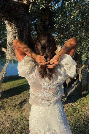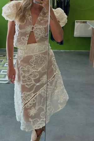 Pair it with the matching Casa Anglaise Blouse. Say goodbye to summertime sadness and hello to the Casa Anglaise Skirt! The floral appliqu embroidered sheer skirt from House of Sunny lets you spice things up in a bold and fun style that will be unique to you. Crafted from airy mesh material, this white piece will keep you feeling cool and comfortable while turning heads. The Casa Anglaise Skirt is all about summer fun and keeping things spicy and hot wherever you go. As seen on @rubydawsonxx, @sullivang_, @tabithamy1, and @tia_dewitt. - High waist fit. - Wide waistband detailing. - Asymmetric button detail. - Asymmetric hem. - Floral appliqu detailing all over. - Sequin embellishments. - A-line silhouette. - Midi length. - Unlined. - Item not sold as a set. Buy the matching Casa Anglaise Blouse. - Color: Oat. - Light-weight non-stretch sheer fabrication. - Material: 100% Polyester. - Measurement: UK 6 (US 2) XS: Length 32 (82 cm), Waist 29" (74 cm). UK 8 (US 4) S: Length 32.7 (83 cm), Waist 31" (79 cm). UK 10 (US 6) M: Length 33 (84 cm), Waist 33" (84 cm). UK 12 (US 8) L: Length 33.5 (85 cm), Waist 35" (89 cm). - Runs slightly small. We recommend sizing up for the perfect fit. - Model is 5'9" (175 cm) and wearing UK 6 (US 2 or XS). - Hand wash only or professional clean. Wash with similar colors. Do not bleach. Do not tumble dry. Iron on low heat. - Recycled labels and biodegradable poly bags.