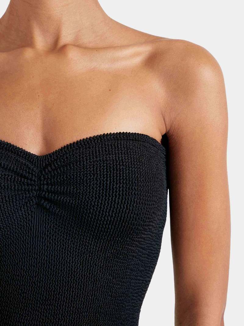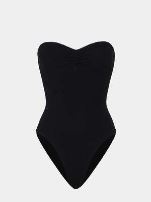 Strictly no tan lines in this strapless style. Minimal meets glam with a ruched sweetheart neckline and figure-sculpting silhouette. All swim purchases are FINAL SALE. Say goodbye to sizing stress. Hunza G's signature Original Crinkle fabrication stretches to flex, sculpt, and support every curve, adapting to all body types in a unique one-size fit to provide confidence and style for every body. The one-size design offers a custom-like fit for UK 6-18 (US 2-14). Hunza G swimwear returns to its original shape after every wear, making it a timeless choice for your swim collectsion, made for whatever life brings.