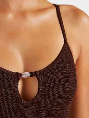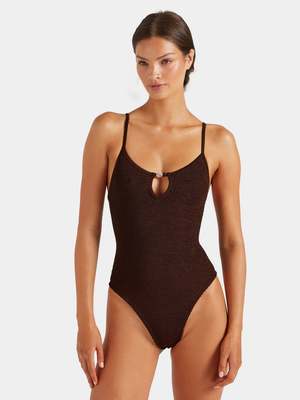 This one-piece swimsuit features delicate straps and a scoop neck, updated with a flirty keyhole and glassy bead detailing. All swim purchases are FINAL SALE. Say goodbye to sizing stress. Hunza G's signature Original Crinkle fabrication stretches to flex, sculpt, and support every curve, adapting to all body types in a unique one-size fit to provide confidence and style for every body. The one-size design offers a custom-like fit for UK 6-18 (US 2-14). Hunza G swimwear returns to its original shape after every wear, making it a timeless choice for your swim collectsion, made for whatever life brings.