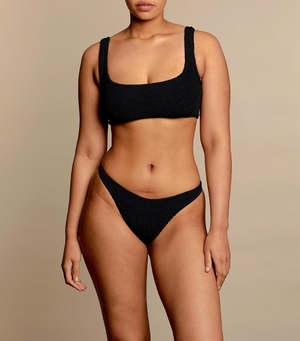 Sporty square neck bikini with wide comfy straps that pulls over head. Medium coverage bikini bottoms can be pulled up higher on the leg depending on the look/coverage you'd like. A bestseller! - Signature Hunza G crinkle fabric - 88% Nylon /12% Lycra Elastane - Sold as set - Handwash and air dry - Made in England - One size fits lots