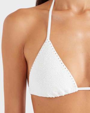 A feminine yet sporty triangle bikini set with contrast trim. Features a halter and back tie triangle top, high cut tie side bikini bottom, and real Swarovski crystals. Made from Hunza G's signature Original Crinkle fabric. Adjustable ties, light bust support, and medium coverage. One size fits lots.