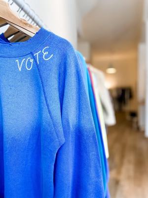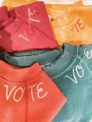 The coziest, softest, one size fits most sweatshirt with hand embroidered "Vote" around the neckline. Available in a rainbow of colors! 50% Cotton 50% Acrylic Machine wash Made in the USA These are vintage sweatshirts that have been dip dyed and hand embroidered.