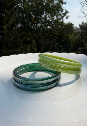 A modern ode to a timeless tradition, these opaque glass bangles draw inspiration from everyday adornment beloved across South Asia. Crafted from richly colored, fully opaque glass, they bring a soft, lustrous finish that feels both nostalgic and contemporary. Lightweight yet striking, they add an effortless pop of color and eleganceperfect for stacking, styling solo, or weaving into your daily ritual. As all pieces are handmade, minor variations and imperfections are natural and part of their unique charm. Colors may also vary slightly due to lighting and camera differences. Material: Glass Size: Inner diameter: 2.4 inches. Ensure your hand circumference can comfortably pass through this opening. Care Instructions: Store separately in a soft pouch or bangle box to avoid scratches. Keep away from water, perfumes, lotions, and humidity to preserve the gold-toned accents. Handle gentlyglass bangles are fragile. Wear last and remove first to prevent accidental breakage. Clean with a soft, dry cloth. Avoid pressure; do not force the bangles on or off.