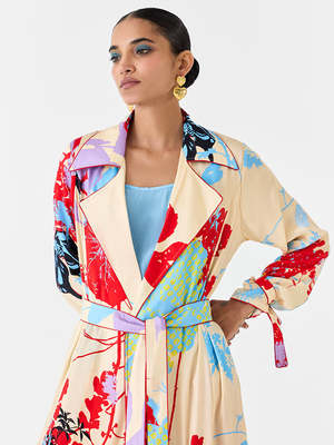 The Ikigai Trench Coat & Ombre Slip Dress set by IKKIVI is crafted from stunning Vegan Silk fabrication, making it a statement piece for any season. The trench coat features digitally printed shibori and ikigai print, piping details, and comes with a belt. It has a straight fit and is paired with a contrast ombre slip in crepe. Each piece is handcrafted with breathable, organic fabrics and unique hand-done details. Care instructions: Dry clean only. The model is wearing a size S.
