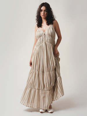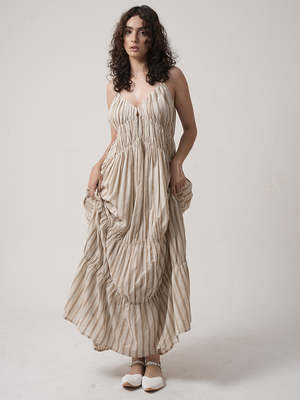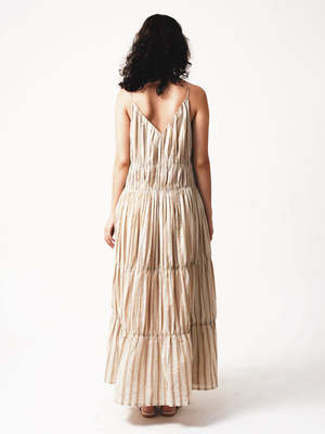 This dress embodies quiet sophistication. Designed in a soft tan hue with subtle vertical stripes, its lightweight fabric drapes effortlessly over the body. A gently gathered bodice, delicate spaghetti straps, and an A-line silhouette create a look that feels both refined and free-spirited. Whether styled for a long afternoon or an evening out, this piece blends comfort and elegance with ease. Material: 100% Cotton Colors: Greige and Tan Stripe Length: 54" The model is 5'8" and is wearing size XS. Care Instructions: Mild hand wash. Hand wash in cold water separately.