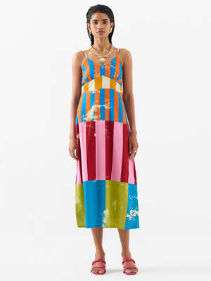 The Long Beach Strappy Dress by IKKIVI is a statement piece crafted from 100% cotton. This trans-seasonal dress features a multi-color stripes print, is lined, and has a relaxed fit with straps. The design includes gathers on the back for added detail and a summery look. Each piece is hand-crafted with care by artisans across India using breathable, organic fabrics and unique hand-done details such as buttons, trims, patches, and embroideries. The model is wearing a size S. Care Instructions: Dry Clean Only. Made in India.
